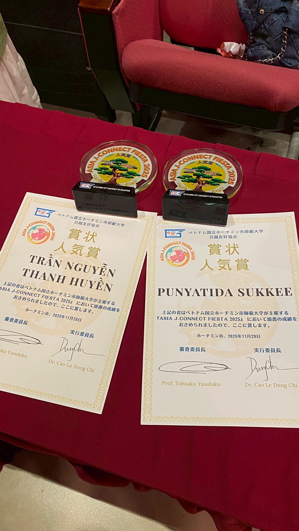 นางสาวปุณยธิดา สุขขี นักศึกษาวิชาเอกภาษาญี่ปุ่นชั้นปีที่ 3 เป็นตัวแทนเข้าร่วมงานประกวดสุนทรพจน์ภาษาญี่ปุ่นในงาน ASIA J-CONNECT FIESTA 2025 ในหัวข้อ 「睡眠と心の元気」เมื่อวันที่ 29 พฤศจิกายน 2568 ณ ホーチミン市師範大学 นครโฮจิมินห์ ประเทศเวียดนาม ผลการประกวด นางสาวปุณยธิดาได้รับรางวัล POPULAR VOTE คู่กับนักศึกษาชาวเวียดนาม